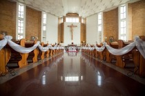 Wystrój kościoła na ślub Gdynia. Białe wianki rattanowe udekorowane kwiatami.